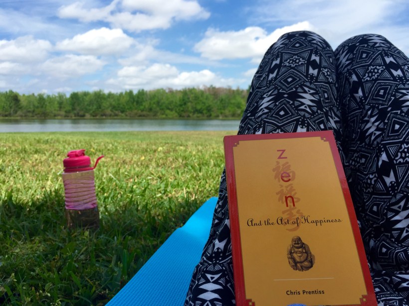 What a peaceful and beautiful Sunday afternoon. I decided to venture my way to my community backyard by the little pond to read my new book, a wonderful gift called “Zen and the Art of Happiness” by Chris Prentiss. I just received it this morning and was excited to start reading. My room on the other hand did not have any sunlight and was quite chilly for a summer day in Orlando (it’s like 80 degrees out but my room was very cool. Both good and bad thing). Nevertheless, I took my hat, sunglasses, a bottle of water, my blue yoga mat and sat under the shade. Oh, I even took my panda bear as a pillow to lay on. I figure if I’m doing this I’m going to be comfortable. My brother was kind enough to help me with my things, we found a spot and he left. This was the second time I laid my mat outside on the grass. I forget how soft the ground actual is. The Earth beneath us feels amazing! I placed my mat in the direction of the pond and I laid on my panda bear. The soft breeze brushed against my face and body allowing me to in take the moment and enjoy the nature. I hear birds chirping, crickets (or just bugs buzzing) around me, and the fading in and out of the AC units behind me by the townhouses. It’s only loud when I pay attention to it, it fades when my mind is concentrating elsewhere. I gazed up to the sky filled with puffy white clouds and I thought to myself as I did when I first moved to Orlando, the sky here is so beautiful. The visibility is incredible and you can see very far!