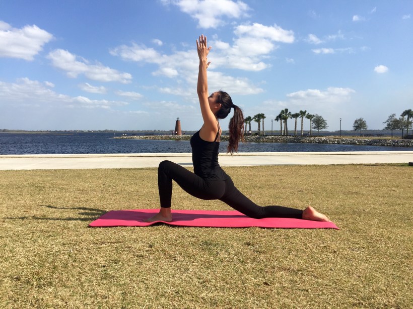 (“Deepened Forward Launch” – enhances flexibility in the hips as well as inner thighs. Arms above your head, focus on balance. )