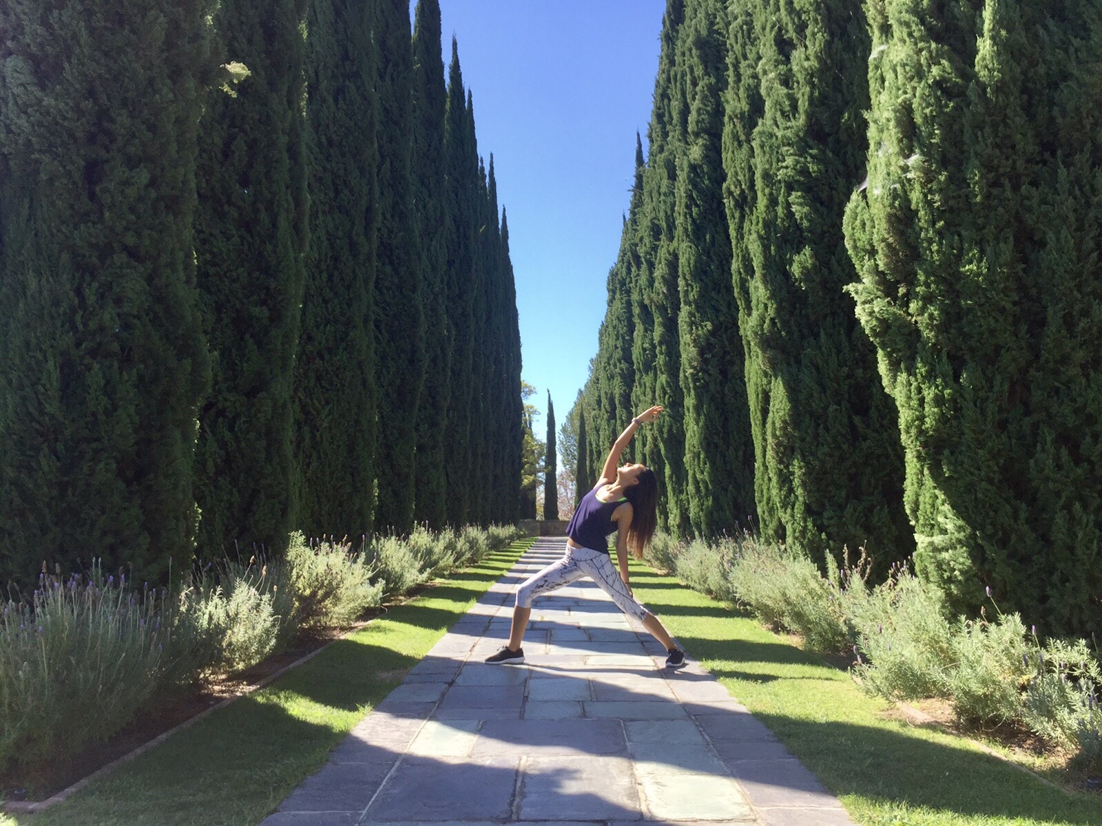 (Peaceful “Shanti” Warrior- A graceful transition from warrior II, take deep breaths while holding the pose. This pose help strengthens the back, increase flexibility and widens the hips while building strength in your legs.)