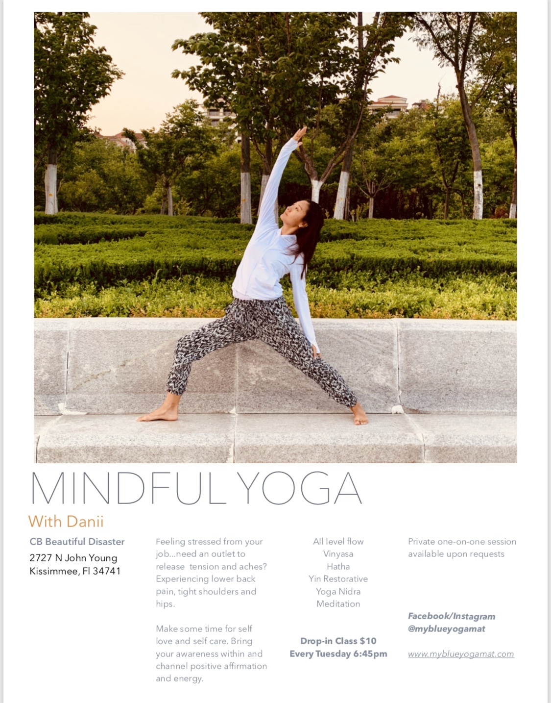 Namaste friends, just want to let you guys know that I will be teaching every Tuesday at 6:45pm at CF Beautiful Disaster. Please try to arrive 15 mins before to get a spot. Bring your mat, towel, and water ! $10 drop-in for everyone, 60 mins class! ππΌπ§ββοΈπ€